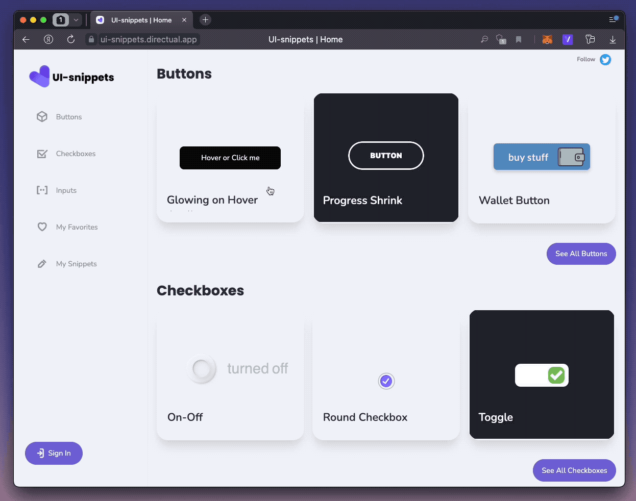 I always like to see beautiful and modern designs in my projects, which is why search the web continuously for noteworthy elements. I’ve made UI-snippets to be a simple app containing an increasingly large collection of awesome snippets—checkboxes, buttons, toggle switches, inputs, and more types later.