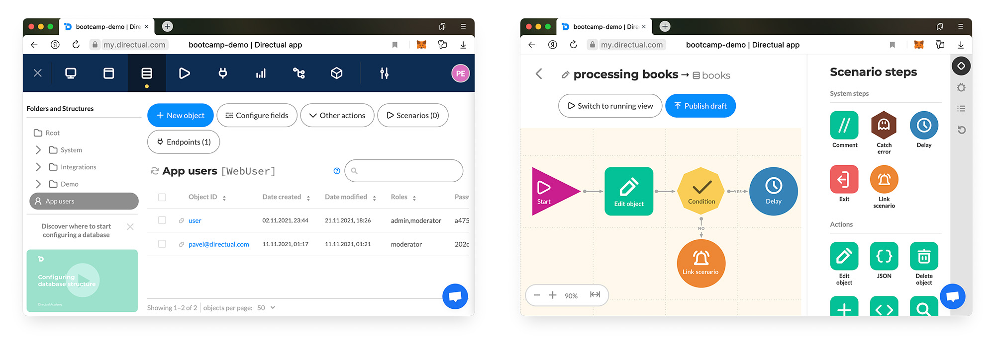 To run a Make scenario you don’t need anything but that scenario. Just configure it and push ”Run”. Directual scenario requires a bit more work. First, you need to configure a data structure, and then — run your scenario. The object is necessary for running Directual scenario. Even if you want to run a scheduled scenario without manipulating any data, you’ll need to have an object as a trigger! However, such an approach (data driven one) seems more reliable and easier to scale.