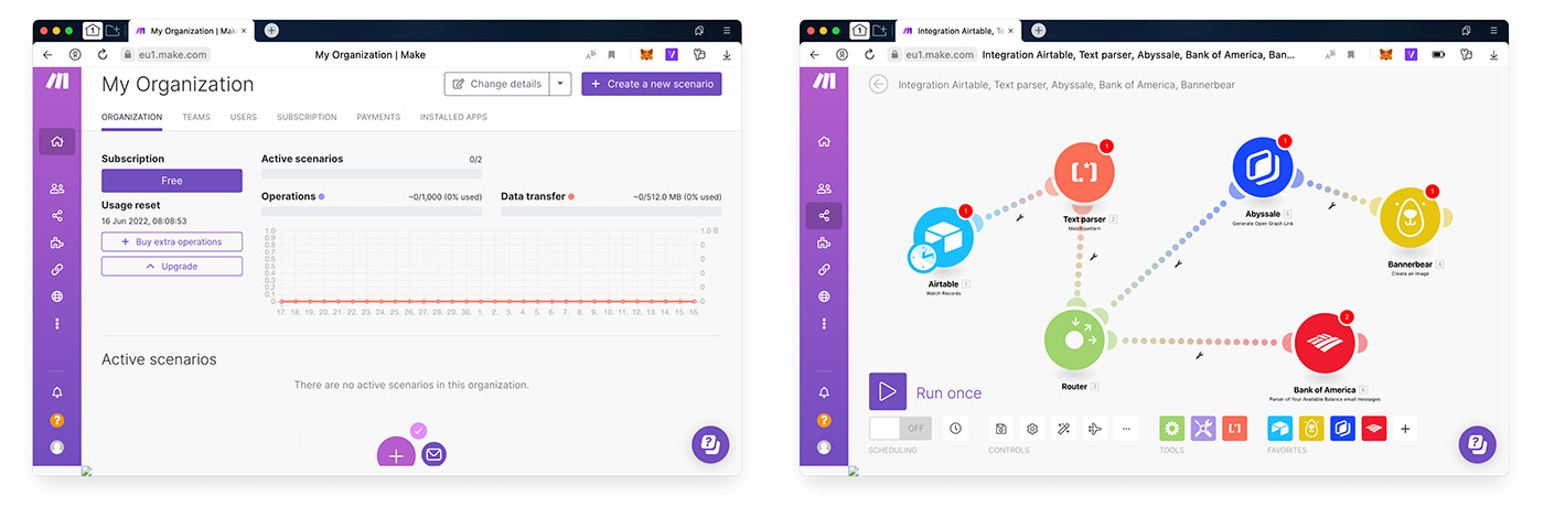 * Scenarios process data multiple times faster compared to Make; * Suitable for work with microservice architecture; * Built-in UI-builder, perfect for internal apps; * Blockchain integration; * Advanced instruments for back-end development (databases, API, and user role-model configuration); * Scaling is easy — the cost is progressive with server load.